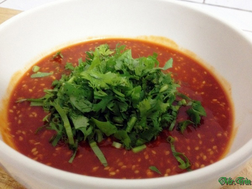 2. ตักส่วนผสมใส่ถ้วย เติมพริกป่น และถั่วลิสงคั่วบดหยาบ คนผสมให้เข้ากัน พร้อมเสิร์ฟ