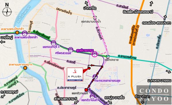 การเดินทางเริ่มจาก แยกติวานนท์ ⇒ ถนนติวานนท์ ⇒ ถนนเรวดี ⇒ ซอยเรวดี 18 ตรงไปอีก 70 เมตรถึงโครงการ A Plus Condo รัตนาธิเบศร์–ติวานนท์