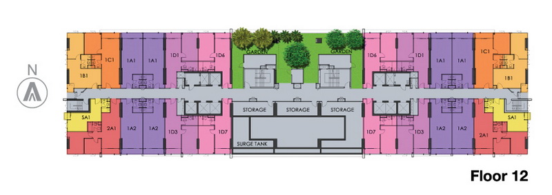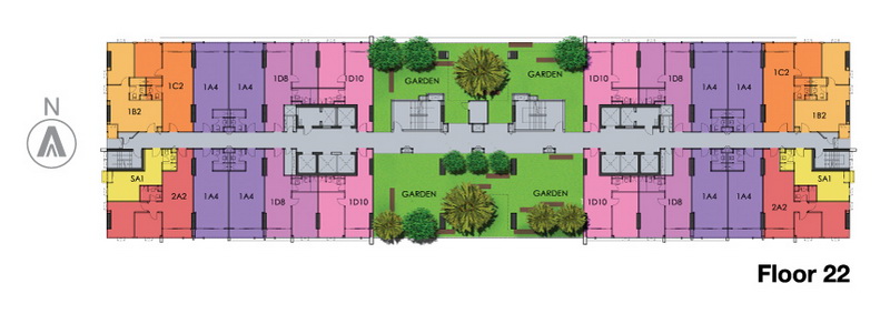 แปลนชั้น 4-11 ของอาคาร A เป็นชั้นพักอาศัยทั้งหมด ห้องที่อยู่ฝั่งทางทิศเหนือจะได้วิวสวนส่วนกลางของโครงการ