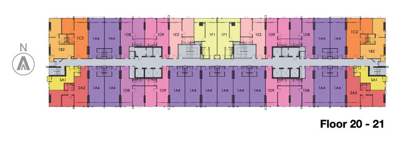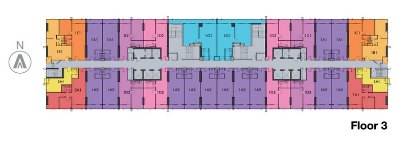 แปลนชั้น 3 ของอาคาร A เป็นชั้นพักอาศัยทั้งหมด มีลิฟต์โดยสาร 6 ตัวและลิฟต์เซอร์วิส 2 ตัว แบ่งเป็นสองฝั่งทำให้แต่ละห้องจะเดินไม่ไกลเพื่อมาใช้ลิฟต์ค่ะ