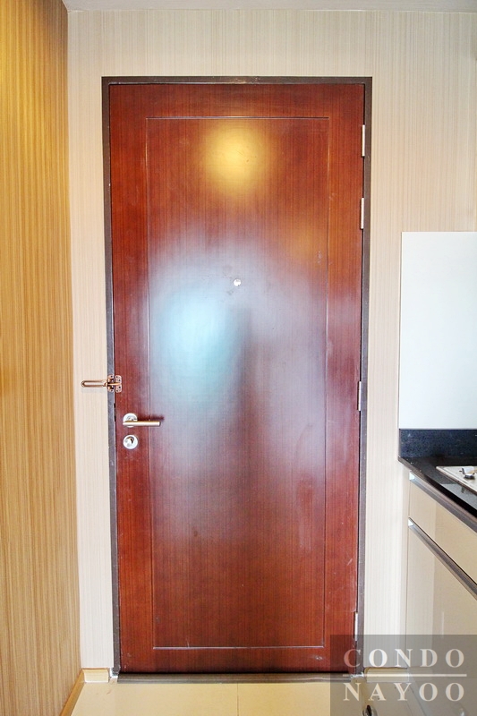 ตรงข้ามครัวเป็นห้องน้ำ ประตูห้องน้ำเป็นสีน้ำตาลเข้มโทนเดียวกับประตูทางเข้าห้องพัก