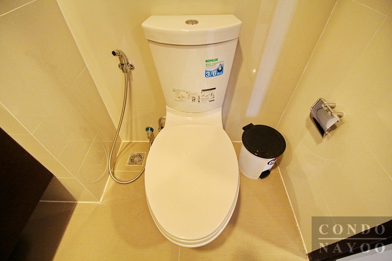 ติดกับประตูจะเป็นโถสุขภัณฑ์ของ Kohler พร้อมสายชำระที่ที่ใส่ทิชชู่