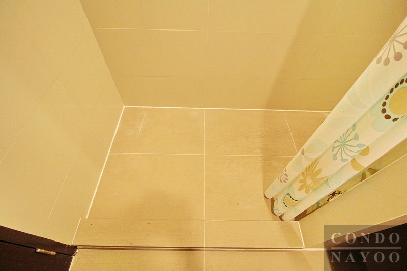 พื้นห้องน้ำลดระดับลงไปเล็กน้อย พื้นปูด้วยแกรนิตโต้แบบหยาบขนาด 60×60 ซม. สีครีม