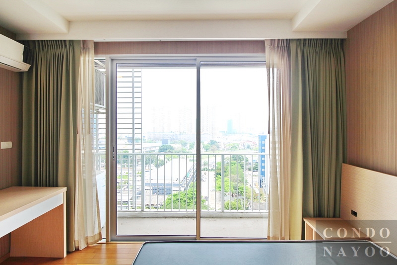 ด้านข้างนี้เป็นระเบียง ประตูเป็นประตูกระจกบานเลื่อน ด้านนี้เป็นกระจกทั้งหมดทำให้ห้องดูสว่างและโปร่ง