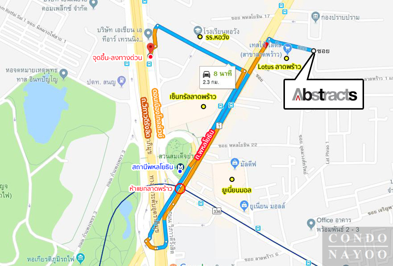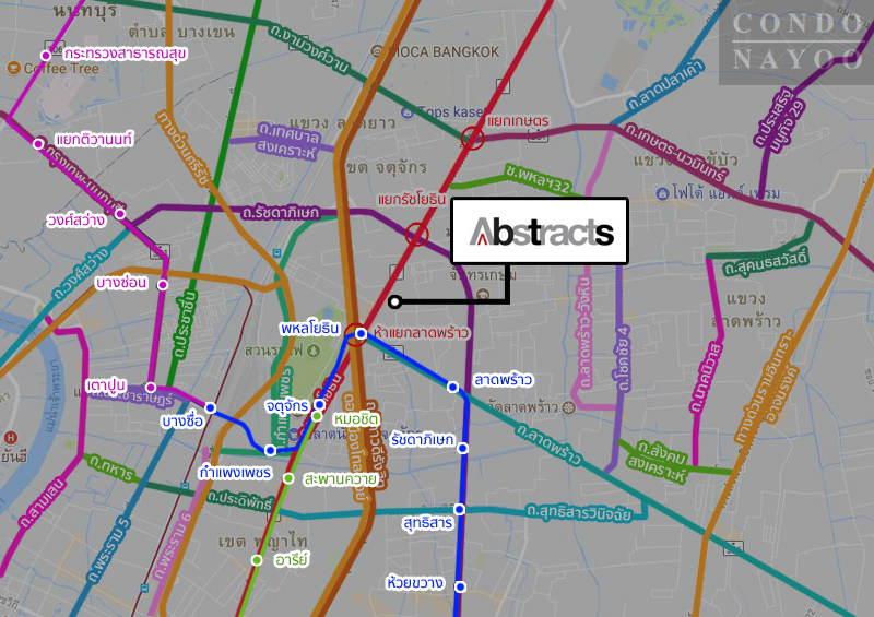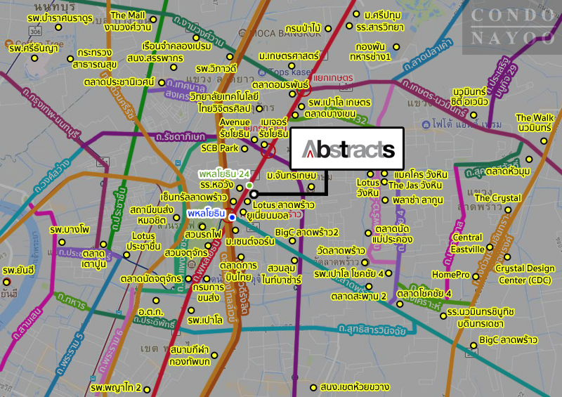 ทำเลที่ตั้งโครงการ – โครงการ Abstracts พหลโยธิน พาร์ค ตั้งอยู่บนถนนพหลโยธิน ซึ่งเป็นถนนหลักเส้นใหญ่ที่มีการจราจรคึกคัก ไม่ไกลจากแยกรัชโยธินและห้าแยกลาดพร้าว จึงเป็นเส้นที่เชื่อมต่อกับถนนหลายสายเดินทางได้สะดวก เดินทางด้วยรถสาธารณะก็สะดวกเพราะใกล้ MRT พหลโยธินอีกทั้งในอนาคตจะมีรถไฟฟ้าสายสีเขียววิ่งผ่าน จึงทำให้การเดินทางสะดวกยิ่งขึ้น ไม่ไกลจากสถานที่ราชการ สถานศึกษาและห้างสรรพสินค้าใหญ่ๆหลายแห่งทั้งโลตัสลาดพร้าว, เซ็นทรัลลาดพร้าวและยูเนี่ยนมอล
