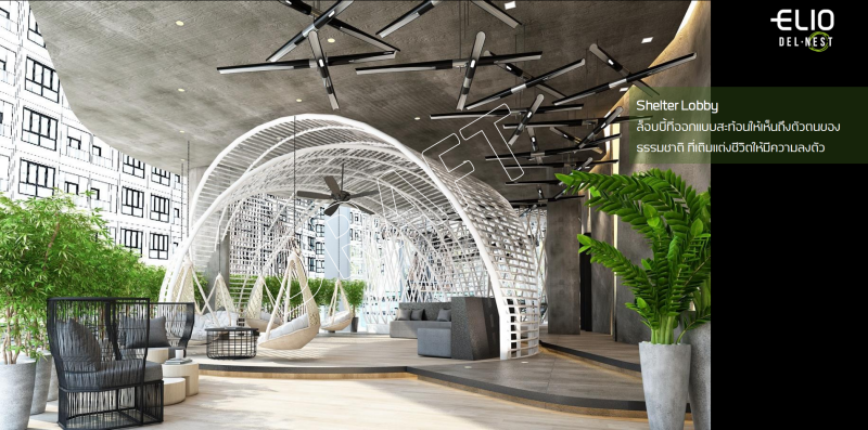 ภาพจำลองส่วน Shelter Lobby ล็อบบี้ที่ออกแบบสะท้อนให้เห็นถึงตัวตนของ ธรรมชาติ ที่เติมแต่งชีวิตให้มีความลงตัว จะเห็นว่ามีซุ้มตกแต่งเป็นโครงเหมือนรังนกสีขาว ตามชื่อ Elio Del Nest ของโครงการ