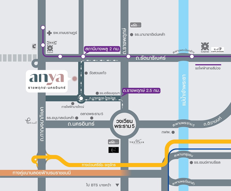 ทำเลที่ตั้ง โครงการ anya ราชพฤกษ์-นครอินทร์ ตั้งอยู่ติดถนนบางกรวย-ไทรน้อย ซึ่งเป็นเส้นที่เชื่อมออกไปได้หลายเส้นทาง โดยจะตัดผ่านถนนจรัญสนิทวงศ์ ถนนนครอินทร์ ถนนราชพฤกษ์ ถนนบางใหญ่บางคูลัด ถนนรัตนาธิเบศร์ และไปสิ้นสุดที่ถนนชัยพฤกษ์ แต่ละเส้นสามารถเชื่อมต่อไปยังโซนต่างๆทั้งเข้าและออกเมืองได้สะดวก โครงการอยู่ใกล้ถนนเส้นหลักสำคัญทั้งถนนราชพฤกษ์ประมาณ 2.5 กม. และถนนรัตนาธิเบศร์ประมาณ 2 กม. และถนนกาญจนาภิเษกประมาณ 4 กม. และยังอยู่ใกล้ทางด่วนศรีรัช-วงแหวนรอบนอก ใกล้รถไฟฟ้าสายสีม่วงสถานีบางพลูเพียง 2 กม. และใกล้แหล่งอำนวยความสะดวกครบครัน