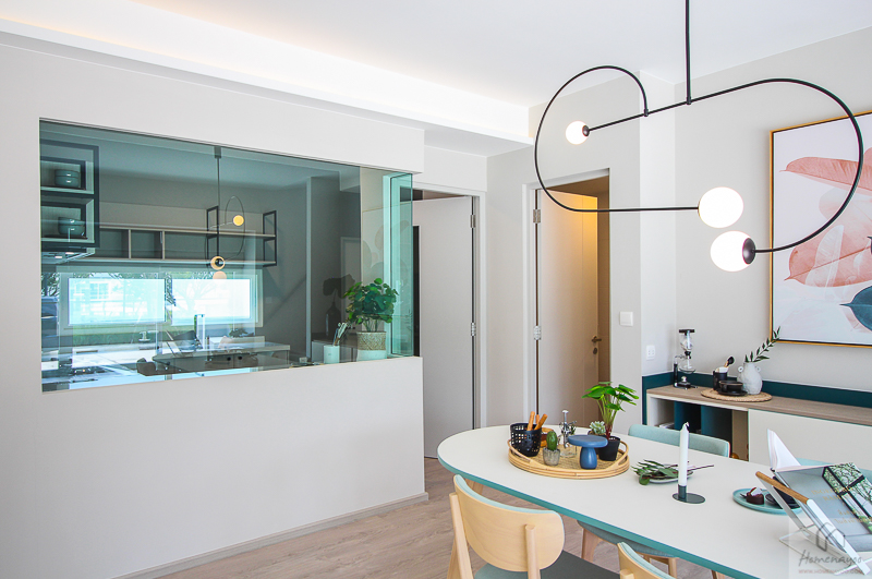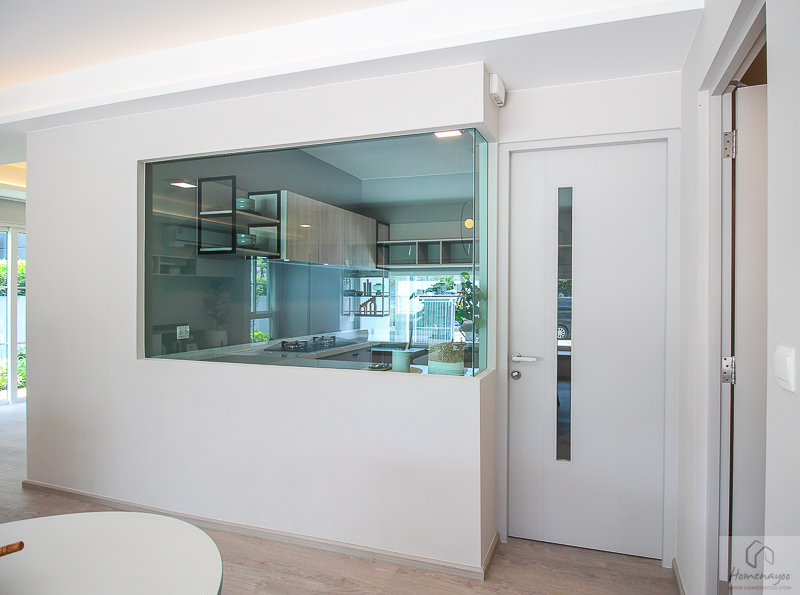 ส่วนครัวจะได้เป็นครัวปิด มีผนังที่เป็นกระจกเพื่อเปิดมุมมองภายในบ้านให้เชื่อมต่อกัน