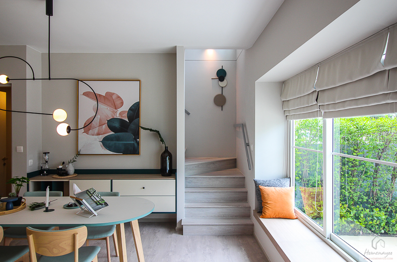 โครงสร้างบันไดเป็น คสล. ปูด้วยพื้นไวนิล SPC ติดราวจับที่กำแพง ยาวต่อเนื่องไปจนถึงชั้น 2 มีช่องแสงขนาดใหญ่ตรงบันได ช่วยดึงแสงจากด้านนอกเข้ามาได้ ส่วนของโถงบันไดนี้เป็นส่วนที่ติดกับบ้านอีกหลัง แต่ทางโครงการใช้ระบบ Double Wall ที่แยกผนังออกจากกัน ทำให้เวลาที่เพื่อนบ้านเดินขึ้น-ลงบันได หรือทำกิจกรรมอันก่อให้เกิดเสียงดัง ก็จะไม่ส่งเสียงรบกวนการพักผ่อนของผู้อยู่อาศัย