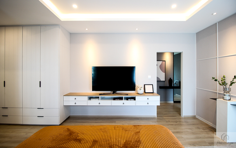 ฝั่งปลายเตียงมีพื้นที่ไว้วางโต๊ะวางทีวี และตู้เสื้อผ้าได้