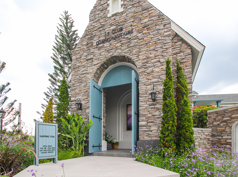 ติดกับทางเข้าออกโครงการ จะมองเห็นอาคารพักผ่อน ที่เป็นเหมือน Glass House ตกแต่งมาในสไตล์ French Country เช่นกัน ตัวอาคารใช้โทนสีฟ้า และตัดด้วยสีเหลืองพาสเทล ด้านหน้ามีสวนน้ำตก มีกลิ่นอายธรรมชาติของฝรั่งเศส