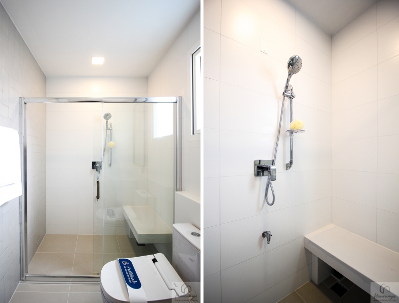 ด้านในจะเป็นพื้นที่ส่วนเปียก ติดตั้งฉากกั้นอาบน้ำ Tempered Glass แบบบานเลื่อนมาให้ ด้านในติดตั้งฝักบัว พร้อมที่นั่งอาบน้ำ และวางอุปกรณ์อาบน้ำได้