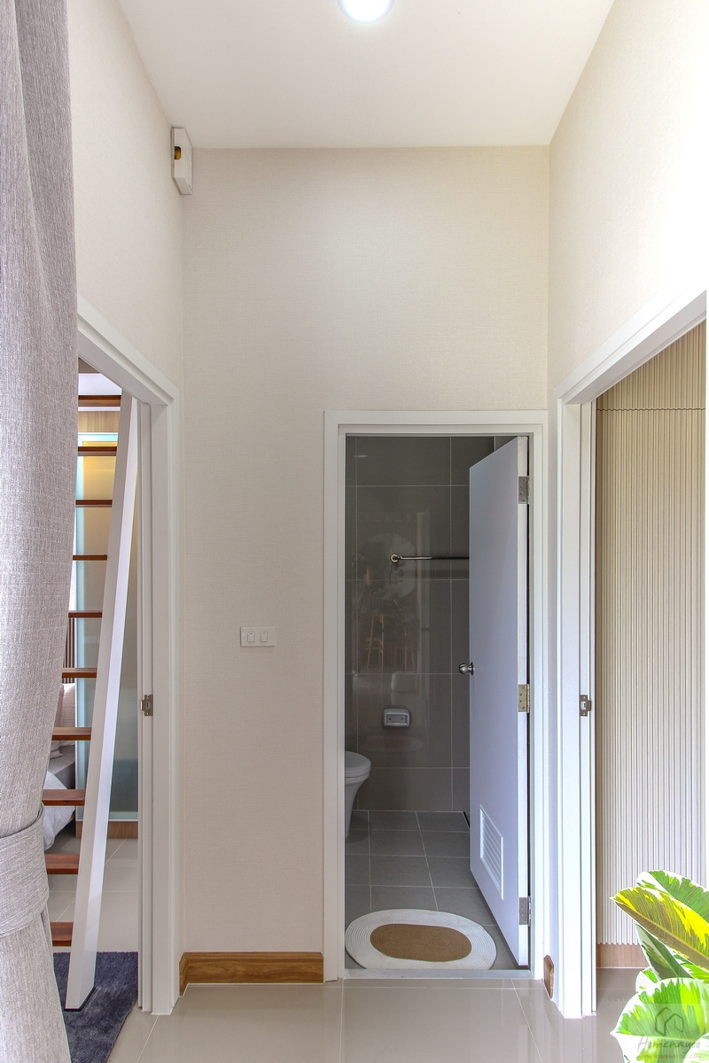 ฝั่งซ้ายของตัวบ้าน จะมีโถงทางเดินเล็ก ๆ เป็นตัวเชื่อมไปยังห้องส่วนที่เหลือ ได้แก่ ห้องน้ำ ที่ตั้งอยู่ตรงกลาง ซึ่งมีการแยกส่วนแห้ง ส่วนเปียกมาให้เรียบร้อย หน้าบ้านจะเป็นห้องนอนใหญ่ พร้อมหน้าต่างช่องแสง Full Height ได้เพดานสูงสุดที่ 5-6 เมตร และมีชั้นลอยเป็นฟังก์ชันเสริมเข้ามา เป็น Gimmick เล็ก ๆ ที่น่ารัก ไม่เหมือนใคร และ สามารถใช้งานได้จริง ทั้งการทำเป็นห้องทำงาน, มุมพักผ่อน อ่านหนังสือ หรือ ทำเป็นห้องเก็บของก็ได้
