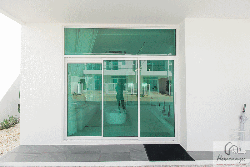 ส่วนประตูทางเข้าตัวบ้านได้เป็นบานสไลด์ 3 ตอน ที่สามารถเปิดได้สุด ด้านบนเป็นบานฟิกซ์ เพิ่มแสงธรรมชาติเข้าสู่ตัวบ้านได้เป็นอย่างดี