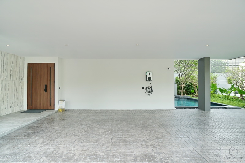 สำหรับบ้าน AMPLE จะจอดรถได้เยอะถึง 4 คัน รถเล็ก รถใหญ่ ถอยเข้าจอดในร่มได้สบาย ๆ ไม่ต้องกลัวติดหลังคา และภายในโรงจอดรถก็จะมีการเตรียมงานระบบเพื่อรองรับการติดตั้ง EV Charger ได้