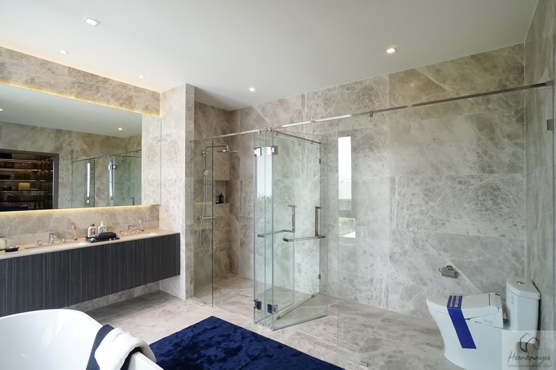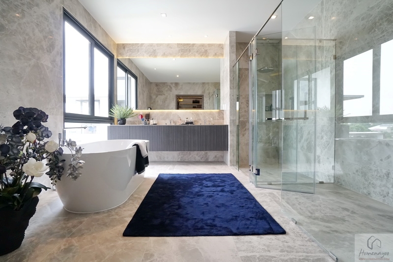 ห้องน้ำเป็นแบบ Full Bath ตกแต่งพื้นผนังลวดลายหรูหราสวยงาม น่าใช้งานมาก ๆ ในห้องนี้จะแบ่งฟังก์ชันไว้ให้ครบ ทั้งเคาน์เตอร์อ่างล้างมือแบบ His & Her, ห้องอาบน้ำ, ห้องโถสุขภัณฑ์ และมี Bathtub สำหรับแช่ตัวจัดเตรียมให้ครบเลยค่ะ