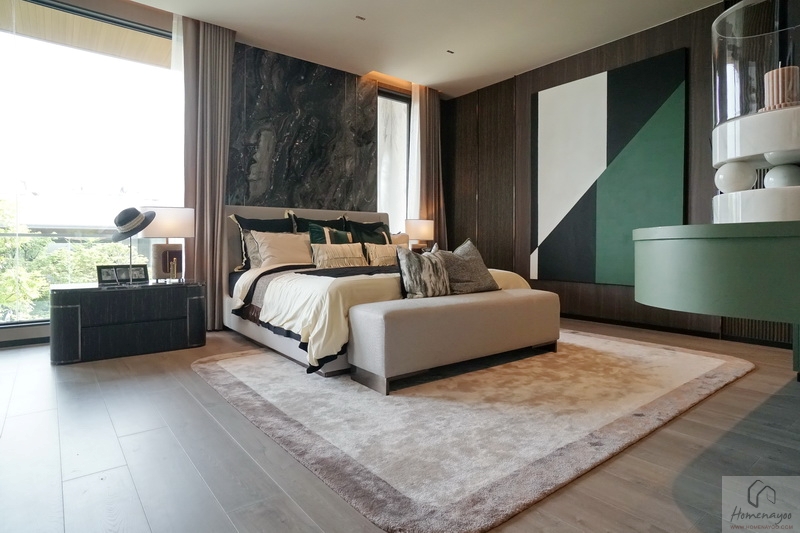 เริ่มที่ Master Bedroom ทางฝั่งหน้าบ้าน ภายในให้ฟังก์ชันแบบ Penthouse เช่นเดิมค่ะ โดยการวาง Layout จะเป็นห้องหน้ากว้างเต็มหน้าบ้าน แบ่งพื้นที่ใช้งานไว้ 2 ส่วนหลัก ๆ คือ ส่วนของเตียงนอน สำหรับพักผ่อน และส่วนที่เป็นพื้นที่ทำงานชมวิวหน้าบ้าน เชื่อมต่อระเบียง, Walk-in Closet และห้องน้ำในตัวแบบ Full Bath ได้อีกทีค่ะ