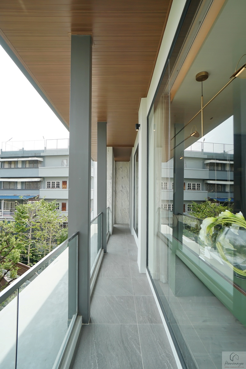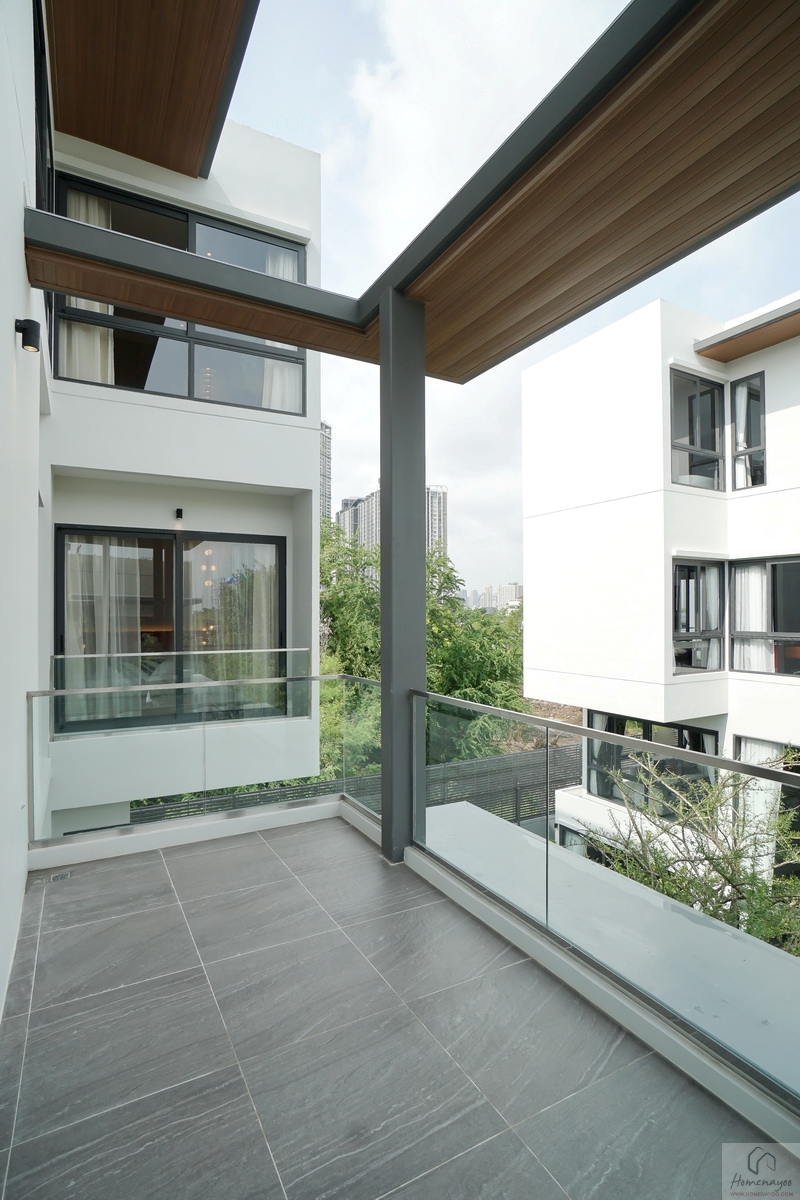 สุดโถงของห้องนอน จะมีประตูกระจกบานเปิดให้ออกมายังระเบียงพักผ่อนส่วนตัวที่ด้านนอกได้ โดยความพิเศษของห้องนี้ นอกจากจะได้ระเบียงแนวยาวทางฝั่งหน้าบ้านแล้ว ยังมีระเบียงขนาดใหญ่ฝั่งข้างบ้าน ให้เราวางชุดโต๊ะน้ำชา จัดปาร์ตี้เล็ก ๆ กับคนในครอบครัวได้ หรือใช้เป็นพื้นที่ปลูกต้นไม้ก็ทำได้สบาย ๆ เลยค่ะ