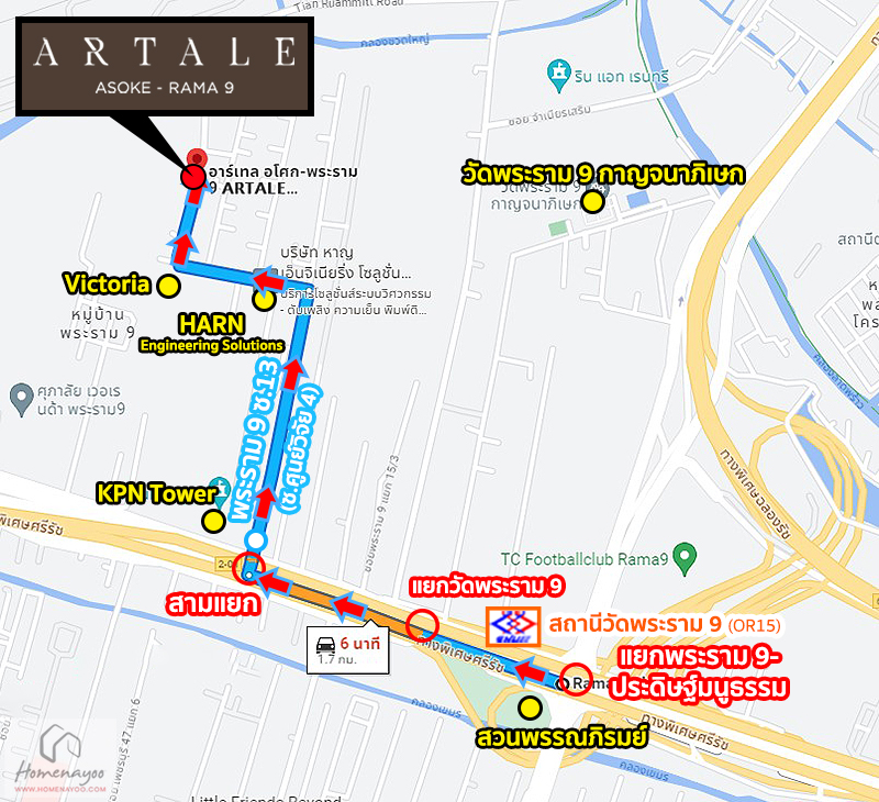 ภาพประกอบการเดินทาง เราใช้ถนนพระราม 9 ฝั่งมุ่งหน้าไปแยกผังเมือง โดยเริ่มกันที่รถไฟฟ้าสายสีส้ม สถานีวัดพระราม 9 ที่ติดกับสวนพรรณภิรมย์ สถานีนี้จะห่างจากโครงการ ARTALE อโศก-พระราม 9 ประมาณ 1.4 กม.* วิ่งเส้นหลักแล้วชิดขวาที่สามแยกตรงปากซอยระราม 9 ซอย 13 หรือซอยศูนย์วิจัย 4