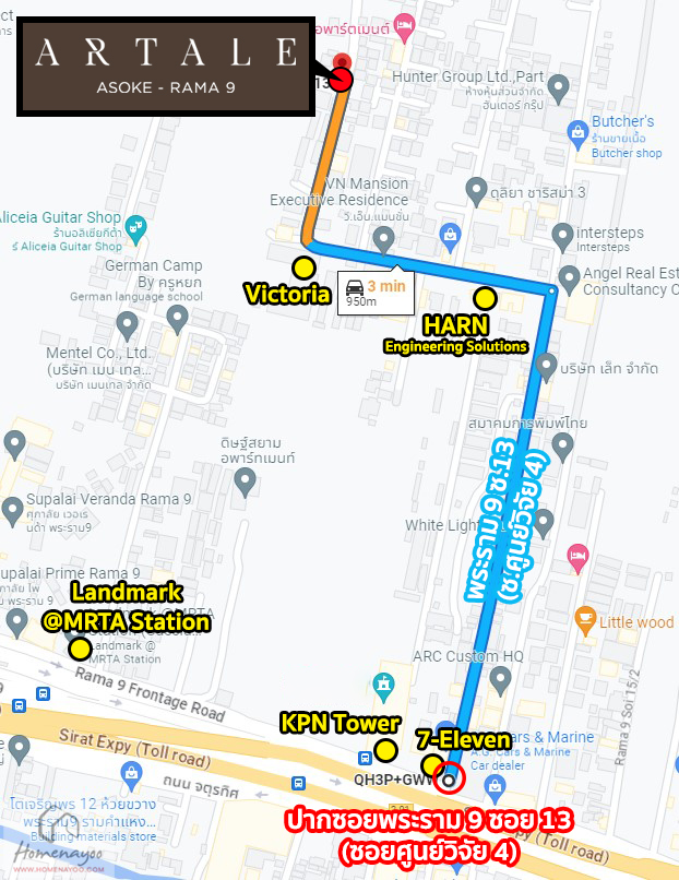 แยกพระราม 9-ประดิษฐ์มนูธรรม ⇒ ถนนพระราม 9 ⇒ สามแยก ⇒ ซอยพระราม 9 ซอย 13 (ซอยศูนย์วิจัย 4) ⇒ ARTALE อโศก-พระราม 9