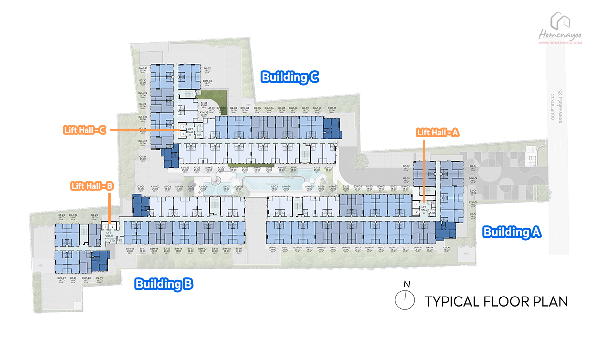 แปลนอาคารชั้น 3-8 เป็น Typical Floor Plan อาคารจะเป็นรูป L-Shape และโถงทางเดินของทั้ง 3 อาคาร เป็นแบบ Double Corridor การวางผังห้องพักจะเหมือนกันทุกชั้น โดยอาคาร A จะมี 33 ยูนิต/ชั้น, อาคาร B จะมี 25 ยูนิต/ชั้น และอาคาร C จะมีทั้งหมด 35 ยูนิต/ชั้น