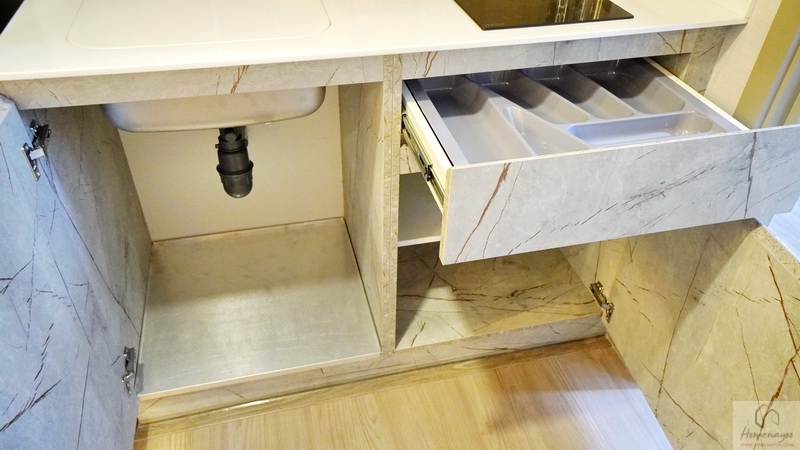 ด้านล่างได้ตู้เก็บของบานเปิดใต้ซิงค์ขนาดใหญ่ มีตู้เก็บของพร้อมชั้นลอย และลิ้นชักพร้อมถาดใส่ช้อน-ส้อมให้แบบในภาพ
