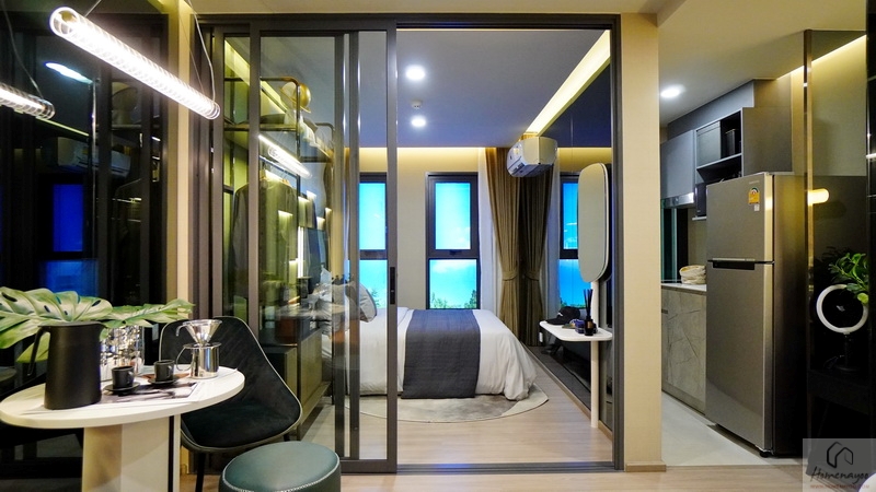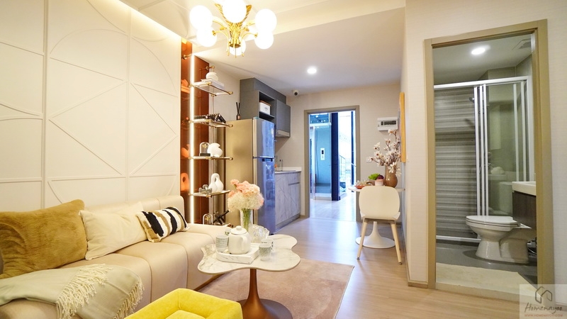 เปิดประตูเข้ามาภายในจะเจอกับ Common Area หรือพื้นที่ของครัวเปิดและมุมทานอาหาร มองต่อเนื่องไปจะเป็น Living Area และห้องนอน ที่อยู่ด้านในสุด ความสูงพื้น-เพดานอยู่ที่ 2.5 เมตร พื้นห้องชุดปูลามิเนตลายไม้สีธรรมชาติ ให้ความรู้สึกผ่อนคลาย ผนังห้องและฝ้าเพดานฉาบเรียบทาสีขาว โคมไฟ Led Panel ประหยัดพลังงาน