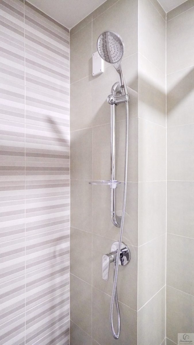 ด้านในติดฝักบัว Hand Shower ของ Cotto พร้อมราวปรับระดับความสูง-ต่ำ และถาดใส่สบู่ ก๊อกน้ำได้เป็นแบบก้านโยก เปิด-ปิดใช้งานได้สะดวก ผนังเดินงานระบบไฟฟ้า ติด Junction Box รองรับการติดตั้งเครื่องทำน้ำอุ่นมาให้เรียบร้อย