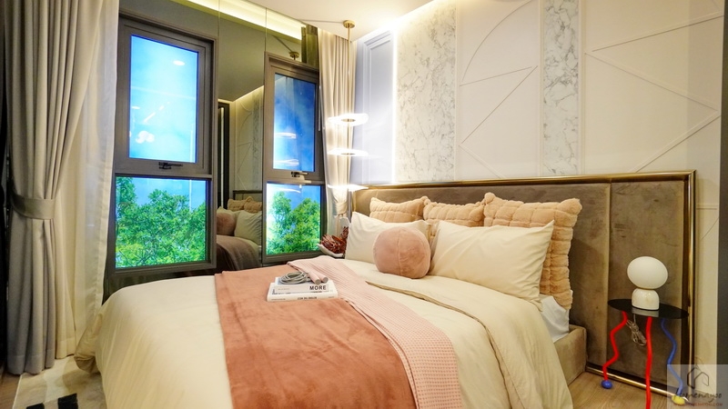 ถัดเข้าไปด้านในซ้ายมือจะเป็นห้องนอน แยกโซนด้วยประตูกระจกบานเลื่อน 3 ตอน ความสูงจรดฝ้าเพดาน ภายในสามารถวางเตียงนอน 5-6 ฟุต และเฟอร์นิเจอร์มาตรฐานได้ครบเซ็ต ฝั่งขวามือจะเป็นห้องครัว จุดนี้เราสามารถกั้นเป็นห้องครัวปิดเองได้ ภายในมีพื้นที่ใช้งานไม่เล็ก ไม่ใหญ่จนเกินไป ตำแหน่งจะอยู่ติดกับระเบียงซักล้าง ซึ่งจะช่วยระบายกลิ่น ระบายอากาศจากการทำอาหารได้เป็นอย่างดีเลยค่ะ