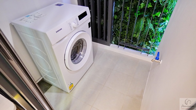 ถัดจากห้องครัวออกไป จะเป็นระเบียงซักล้าง แยกส่วนด้วยประตูกระจกบานเลื่อน 3 ตอน กรอบอะลูมิเนียม Powder Coat สีเทา พร้อมยกธรณี-วงกบสูงขึ้นมา 20 ซม. ที่จะช่วยป้องกันฝุ่นและสิ่งสกปรกพัดเข้ามาภายในห้องพักได้