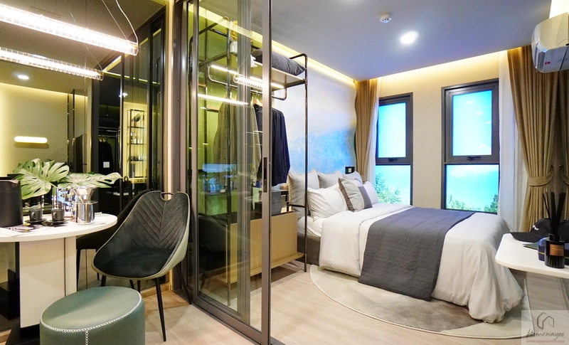 ปลายเตียงห้องจริงจะเป็นผนังเปล่าฉาบเรียบทาสี และมีแอร์ Wall Type ติดมาให้ 1 ตัว จุดนี้สามารถติดทีวีแขวนผนัง หรือชั้นวางของแนวยาวเข้าไปได้ อีกฝั่งจะเป็น Corner สำหรับวางตู้เสื้อผ้า หรือจะวางเฟอร์นิเจอร์อื่น ๆ ก็ได้ตามชอบ