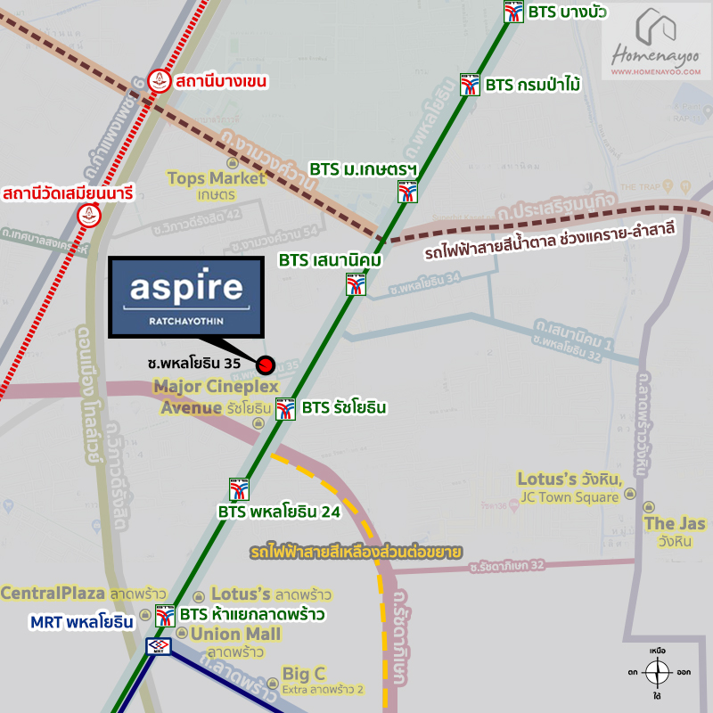 การเดินทางเริ่มจาก ห้าแยกลาดพร้าว ⇒ ถนนพหลโยธิน ⇒ แยกรัชโยธิน ⇒ ซอยพหลโยธิน 35 ⇒ ขับตรงไป ประมาณ 200 เมตร* ถึงโครงการ Aspire รัชโยธิน *ห่างจาก BTS รัชโยธิน ประมาณ 350 เมตร*