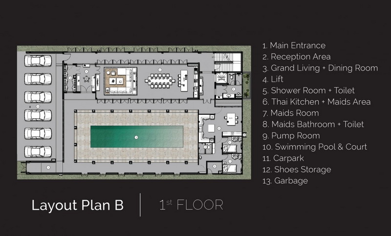 แปลนแบบบ้าน B บ้าน 3 ชั้น สไตล์โรมัน ชั้น 1