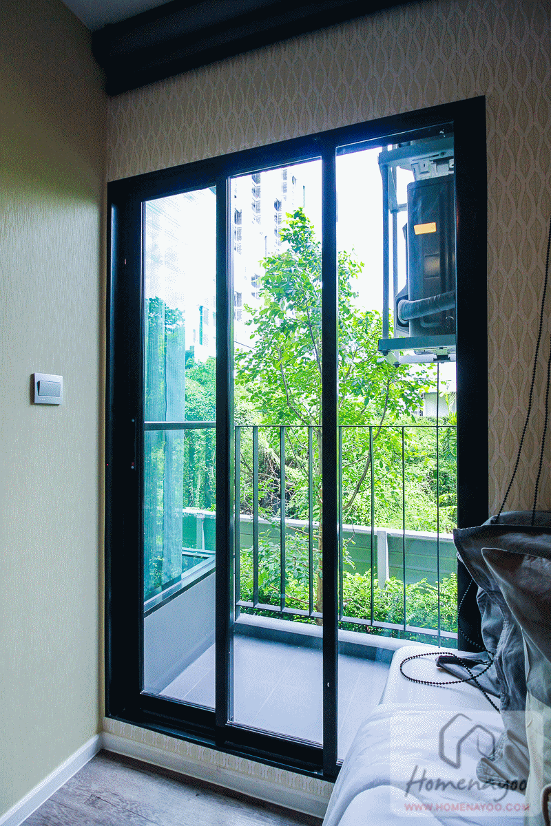 มือจับประตูเป็นแบบเซาะร่องมาตรฐาน และเป็นบานกระจกกรอบอลูมิเนียมสีดำแบบ 3 ตอน ข้อดีคือมีช่องเปิดที่กว้างกว่าบานเปิดแบบ 2 ตอนนั่นเอง