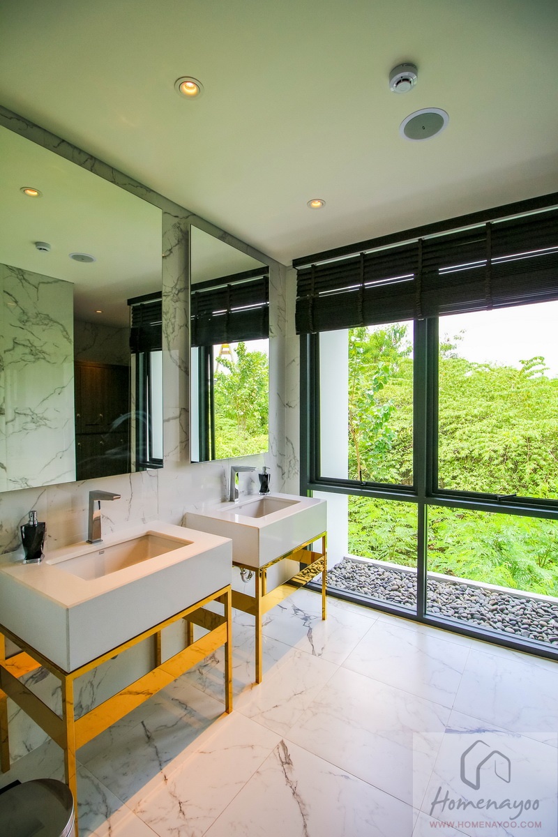 ห้องน้ำขนาดใหญ่แบบ His & Her ตกแต่งหรูหราน่าใช้งาน แบ่งโซนแห้ง โซนอาบน้ำ พิเศษตรงที่มีอ่างอาบน้ำเพิ่มเติมเข้ามาให้ด้วย ส่วนสุขภัณฑ์พรีเมียมจาก American Standard ทั้งหมดค่ะ
