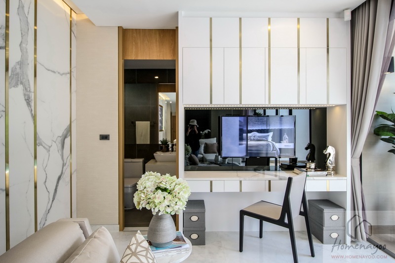 ปลายเตียงรูปแบบเดียวกัน คือ เป็นพื้นที่ของผนังเปล่าที่ใช้สำหรับบิวท์อินชั้นวางทีวี หรือ แขวนทีวีที่ผนัง ติดกันเป็นส่วนของห้องน้ำในตัวนั่นเองค่ะ