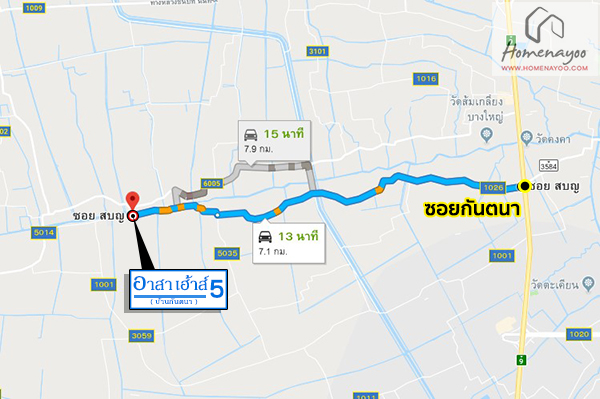 การเดินทางเริ่มจาก ถ.กาญจนาภิเษก วงแหวนรอบนอกฯ ฝั่งตะวันตก ⇒ ถ.บางใหญ่-บางคูลัด (ซ.กันตนา) ขับตรงไปอีก 7.1 กม. ถึงโครงการ อาสาเฮ้าส์ 5 ซ.กันตนา