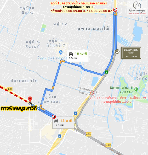 จุดกลับรถจุดที่ 2 นี้จะจำกัดความสูงไม่เกิน 1.80 ม. ห้ามเข้า เช้า 06.00-09.00 น. / เย็น 16.00-20.00 น. (ชั่วโมงเร่งด่วน) และส่วนจุดกลับรถจุดที่ 3 จะอยู่ตรงคลองตะเข้ขบ นะคะ