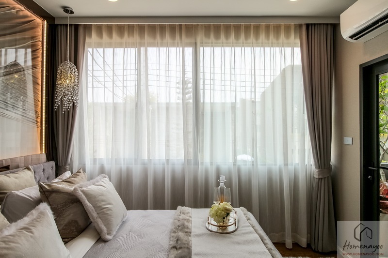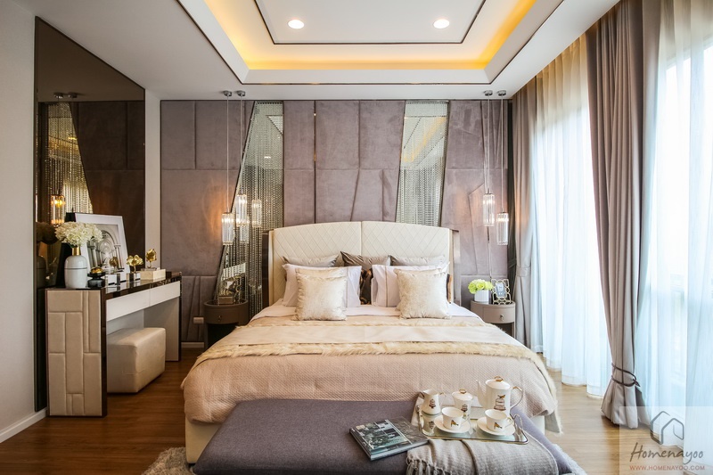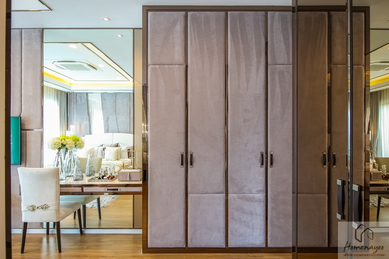 โดยในบ้านตัวอย่าง วางเตียงนอน 5 ฟุต และ บิวท์อินตู้เสื้อผ้า + โต๊ะเครื่องแป้งเข้ามุมมาให้ดูระยะใช้งาน