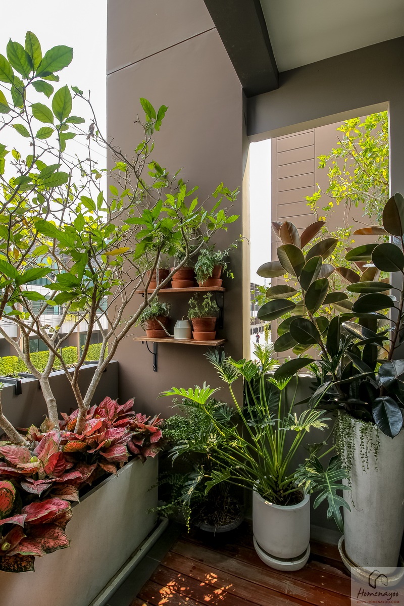 เปิดประตูออกมาจะเจอกับระเบียงขนาดพอเหมาะ หากไม่อยากทำเป็น Pocket Garden สามารถปรับเป็นมุมพักผ่อน วางชุดโต๊ะกลม เก้าอี้สนาม ไว้นั่งจิบชา กาแฟ หรือ ไว้นั่งอ่านหนังสือก็ทำได้ค่ะ