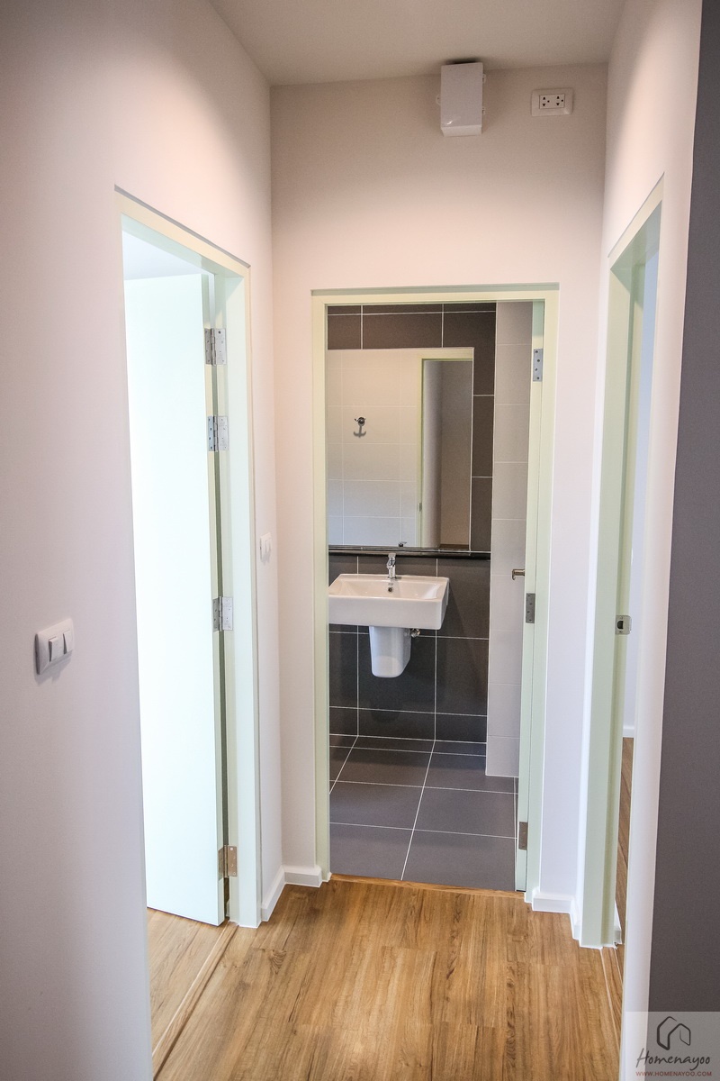 ออกมาดูห้องน้ำที่โถงบ้านชั้น 2 กันต่อ ประตูห้องน้ำจะได้เป็นประตูไม้บานเรียบ มือจับก้านโยกหมุนล็อก เปิด-ปิดใช้งานได้ง่ายกว่าลูกบิดกลมทั่วไป