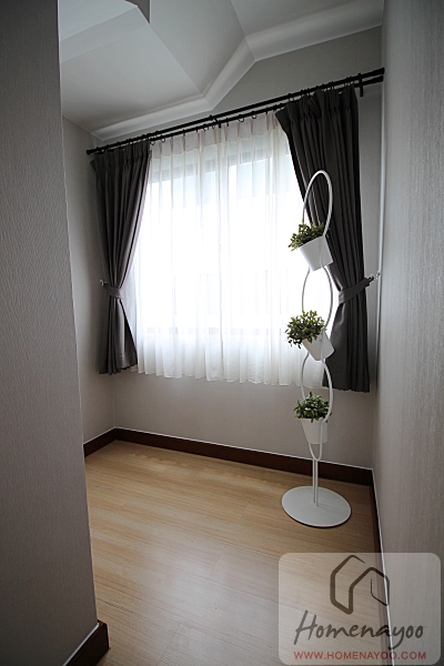 ภาพจากบ้านเปล่ามองไปทางฝั่งปลายเตียงค่ะ ฝั่งปลายเตียงในบ้านตัวอย่างจะวางชั้นวางทีวี ด้านหลังมีตู้เสื้อผ้า และโต๊ะเครื่องแป้ง มาให้ดูเป็นไอเดีย