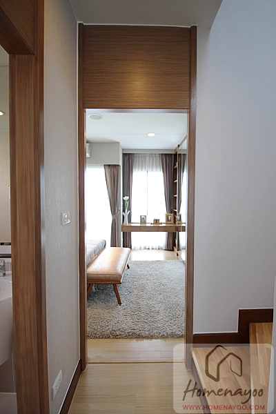 ขึ้นมาชั้น 2 พื้นเป็นไม้ลามิเนตสีอ่อนหนา 8 มม. พอขึ้นมาจะมีมุมที่โถงบันไดที่สามารถวางชั้นวางของ หรือโต๊ะวางของเพิ่มได้