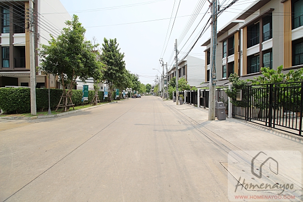 เข้ามาจะเป็นถนนหลักกว้าง 16 เมตรพร้อมสวนหย่อมตกแต่งหน้าโครงการ ที่ปูสนามหญ้าและปลูกรั้วพุ่มไม้มาทั้งสองฝั่งเพื่อมุมมองที่ดูร่มรื่นขึ้น โดยรั้วรอบโครงการจะสูง 3 เมตร ถัดจากซุ้มโครงการเข้ามาจะเป็นสะพานข้ามคลองก่อนเข้าไปในตัวโครงการค่ะ นอกจากทางรถก็จะมีทางเท้ามาให้ทั้งสองฝั่งด้วย