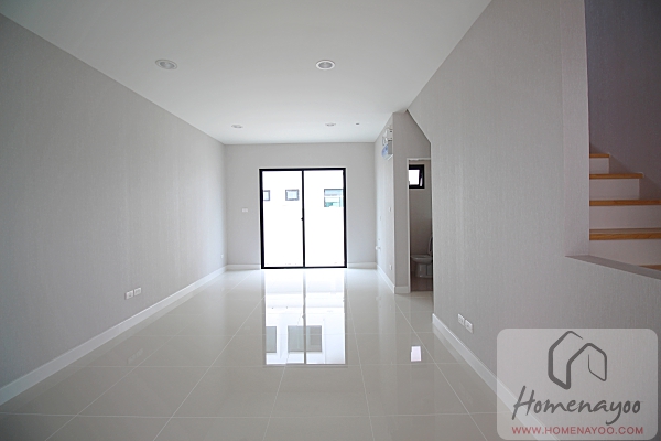 ถ่ายภาพบ้านเปล่าในส่วนห้องรับประทานอาหารและมุมครัวจะมาเป็นโล่งๆแบบนี้นะคะ แต่จะมีเจาะช่องเตรียมงานระบบท่อประปาสำหรับอ่างล้างจานในครัวมาให้เรียบร้อย มีประตูบานเลื่อนเปิดออกไปลานหลังบ้านอยู่
