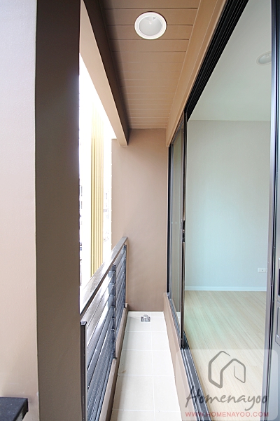 ข้างเตียงจะมีประตูบานเลื่อนเปิดออกไประเบียง ธรณีประตูสูงขึ้นมาประมาณ 10 เซนติเมตรเพื่อกันน้ำและความชื้นจากระเบียง ราวกันตกเป็นเหล็กโปร่งทาสีดำ