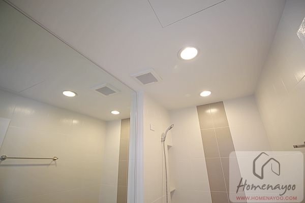 ผนังติดกระจกเงาและปูกระเบื้องมาให้จรดเพดาน และมีหน้าต่างบานกระทุ้งติดมาให้ 1 บาน ใต้หน้าต่างมีราวแขวนผ้าเช็ดตัวติดมาให้เรียบร้อย