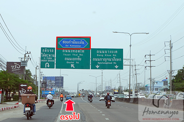 ตรงมาอีกหน่อยจะเห็นป้ายซอยกำนันแม้นแล้วค่ะ เราเบี่ยงซ้ายตรงไปเพื่อกลับรถใต้สะพาน
