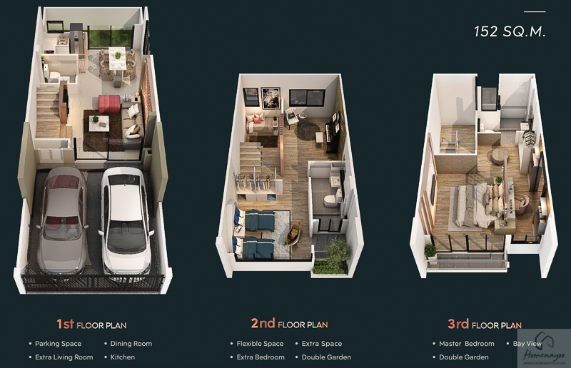 แบบบ้าน – ที่นี่มีให้เลือก 1 แบบ เป็นบ้านทาวน์โฮม 3 ชั้น จุดเด่นของบ้านจะเน้นการออกแบบฟังก์ชันพื้นที่ส่วนต่างๆ ให้สามารถใช้งานได้จริง และสามารถปรับเปลี่ยนได้ตามการของผู้อาศัย การออกแบบได้แรงบันดาลใจมาจากสวนในขวดแก้วที่สร้างพื้นที่สีเขียวเชื่อมต่อเข้ามาสู่ในตัวบ้าน ได้ใกล้ชิดกว่าที่เคยสัมผัส
