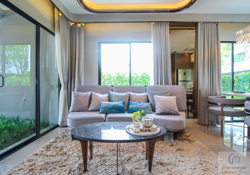 แบบบ้าน – ที่นี่มีให้เลือก 1 แบบคือบ้านทาวน์โฮม บ้านรูปทรงสไตล์ Modern ใช้โทนสีเบจและน้ำตาล พื้นที่ในบ้านทำมาได้น่าอยู่ เน้นช่องแสงเข้าถึงแต่ละส่วนภายในบ้าน แต่ละส่วนของบ้านแบ่งพื้นที่มาให้ไม่อึดอัด ห้องดูโปร่งโล่ง ฝ้าสูง 2.6 ม. พื้นที่ในบ้านสามารถปรับเปลี่ยนได้ตามความต้องการของผู้อาศัย ด้านหลังบ้านมีพื้นที่ให้ต่อเติมได้อีก ตกแต่งเป็น Glass House แบบบ้านตัวอย่างก็สวนดี ที่ชั้นบนห้องนอนแต่ละห้องแบ่งพื้นที่มาได้กว้างดีสามารถวางตู้ โต๊ะ เตียงได้ครบ ห้อง Master Bedroom มีพื้นที่ให้ทำส่วนแต่งตัวได้ ตรงส่วนอเนกประสงค์จะทำเป็นห้องนั่งเล่น ห้องทำงาน หรือกั้นผนังเป็นห้องนอนอีกห้องก็ได้ครับ